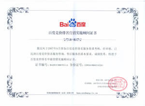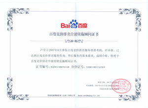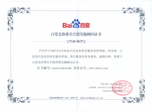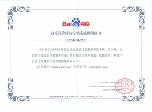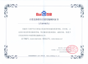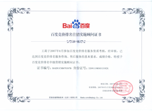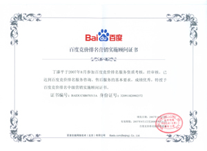 鹽城思科網(wǎng)絡(luò)工程有限公司作為百度鹽城地區(qū)總分銷(xiāo)商,在2007年度參加百度競(jìng)價(jià)排名服務(wù)資質(zhì)考核中,經(jīng)過(guò)公司全體員工們的共同努力,再創(chuàng)佳績(jī),其中通過(guò)中級(jí)服務(wù)認(rèn)證考核8人,3人優(yōu)秀,通過(guò)率達(dá)95%,被全球最大中文搜索引擎——百度在線(北京)有限公司再次授權(quán)百度競(jìng)價(jià)排名鹽城地區(qū)唯一客戶(hù)服務(wù)中心。盡善盡美的售后、全心全意的服務(wù),思科人將用十二分的熱忱等待您的惠顧,共創(chuàng)新紀(jì)元!